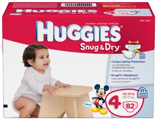 HUGGIESandreg; Snug and Dry Diapers offer protection you can count on, so you can focus on all your little oneandrsquo;s daily adventures. Plus, they also come with the trusted leakage protection of the Leak Lockandreg; System.HUGGIES Snug and Dry Diapers, Size 4, 82-CountAt a Glance: HUGGIES Snug and Dry Diapers have a SnugFit waistband and unique tabs for a secure fitSpecial layer to lock wetness away and help keep your baby dryAdorable graphics featuring Mickey and Friends Disney designsSize 1: Up to 14 poundsSize 2: 12 to 18 poundsSize 3: 16 to 28 poundsSize 4: 22 to 37 poundsSize 5: Over 27 poundsSize 6: Over 35 poundsSee all HUGGIES product sizesView larger.HUGGIES Snug and Dry DiapersHUGGIES Snug and Dry Diapers offer protection you can count on, so you can focus on all your little one's daily adventures. Plus, they also come with the trusted leakage protection of the Leak Lock System. Wipe. Diaper. Repeat.HUGGIES Natural Care Baby Wipes are the gentle clean for a baby's naturally perfect skin. Hypoallergenic, with aloe and vitamin E. View wipes in scented and fragrance free. Earn RewardsParenthood is the ride of your life. HUGGIES is here to help you celebrate it with the HUGGIES Rewards Program. Earn points for the diapers and wipes you buy using the Reward Code on the package. Redeem points for fun rewards, or enter instant win and sweepstakes for valuable prizes. Every Little BottomToday one out of three U.S. families struggle to provide diapers. HUGGIES Every Little Bottom is donating millions of diapers to babies in need. HUGGIES Leak Lock SystemAll HUGGIES diapers come with the trusted leakage protection of the Leak Lock System, which includes absorbent layers and leak guards to help pull in wetness and lock it away. Grip tabs and a SnugFit waistband deliver a secure fit. What's in the BoxHUGGIES Snug and Dry Diapers, Size 4, 82-Count.